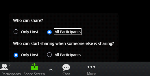 - Share: Anyone who is participating in the meeting can share their screen but if at the same time host and one of the participants wants to share their screen then you can do the below settings.